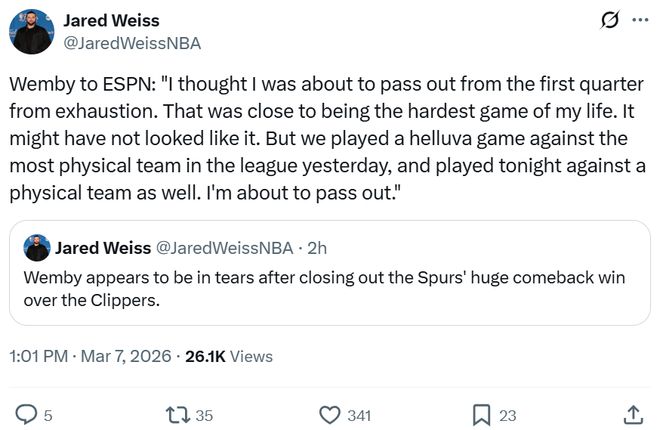 与此同时,文班也表示自己累坏了:“从第一节比赛开始我就累得快要晕倒了,这可能是我生命中最艰难的比赛之一,或许看起来不是这样,但昨天我们才对阵了联盟中身体对抗最激烈的球队,今晚的对手也是如此,我现在真的快要累垮了,接下来自己要好好睡两晚,相信自己很快就能够恢复过来。”
