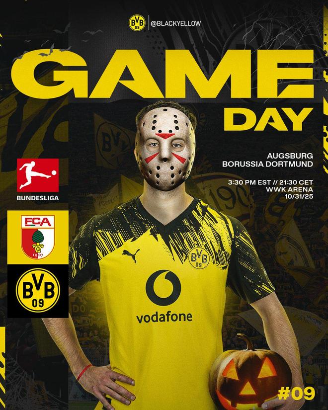 雷速体育10月30日讯 德甲第9轮多特客战奥格斯堡的比赛将在当地时间的万圣夜上演,赛前多特官方也发布了特殊海报预热。